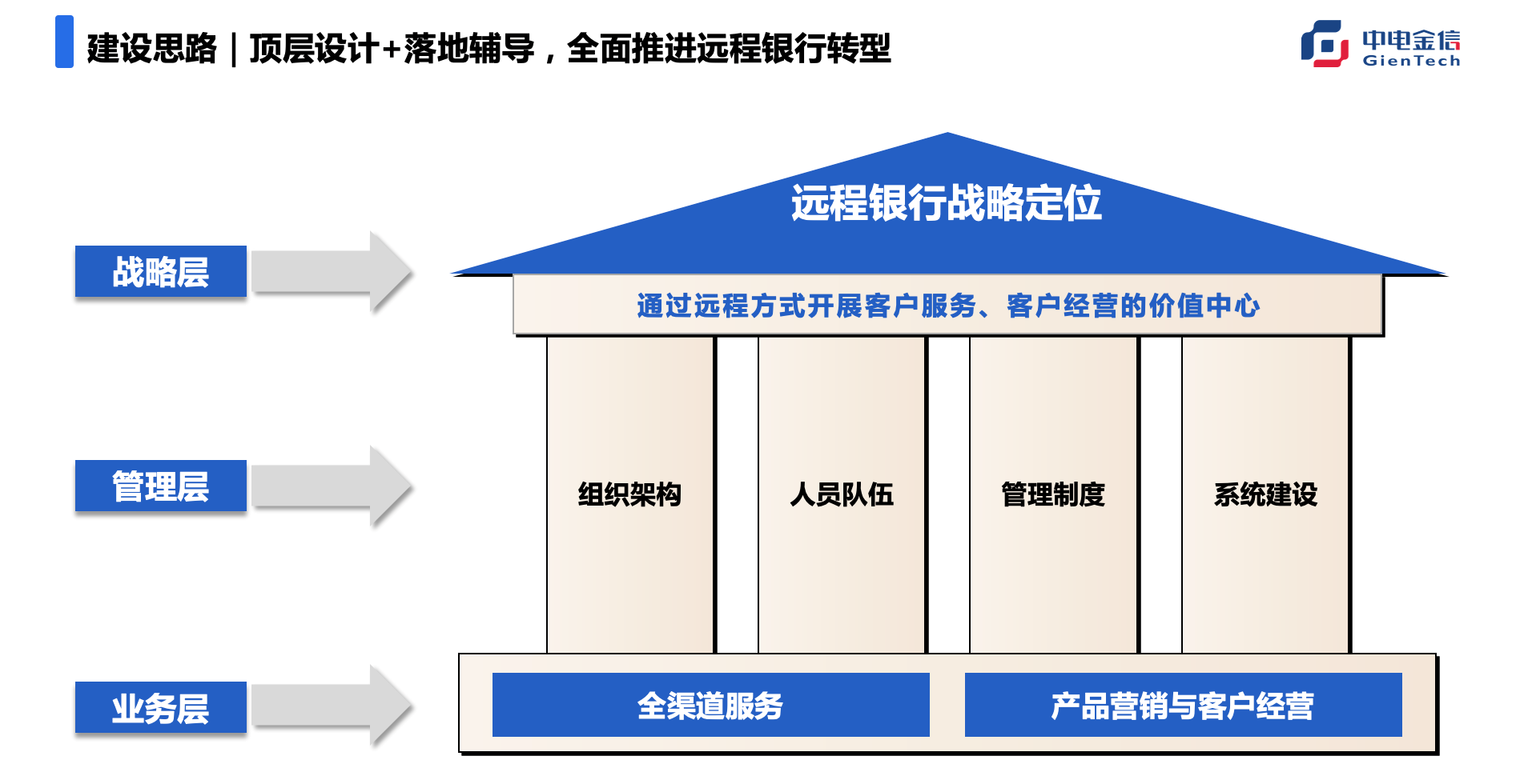 充分剖析监管政策、行内业务现状,分模块设计远程银行,从组织架构、队伍建设、业务转型、系统转型等方面转型,并规划短期与长期建设路径。