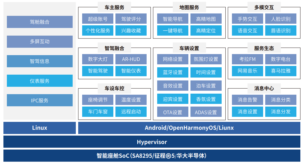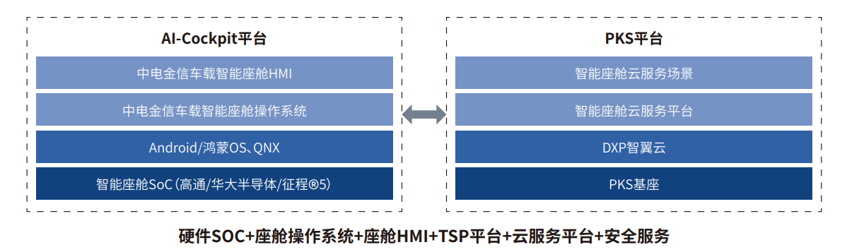 中电金信智能座舱平台采用金融级安全套件,确保车主信息安全。基于CEC(中国电子)PKS基座和中电金信企业数字化创新平台(DXP智翼云),采用自研的车载智能座舱HMI、操作系统,支持鸿蒙OS、华大半导体。